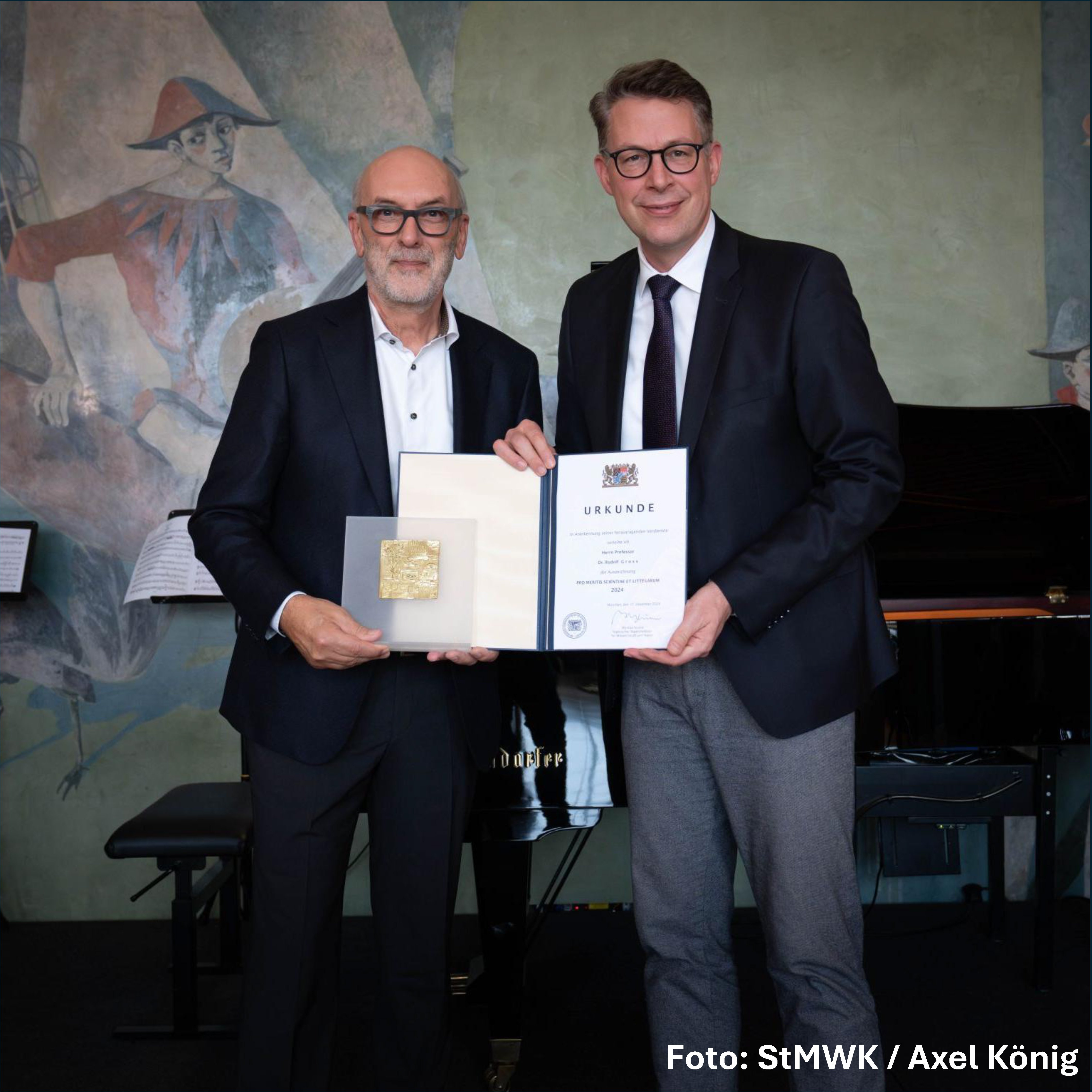 Since 2000, the State Ministry of Science and the Arts has been awarding the PRO MERITIS SCIENTIAE ET LITTERARUM prize to outstanding individuals for their services to science and the arts. On October 28, 2025, Minister of State Blume presented this award to Rudolf Gross, the long-standing director of WMI. "He laid the foundations for the institute's international leadership position. With his deep technical expertise and strategic foresight, he has made the Bavarian quantum ecosystem what it is today – one of Europe's most important centers for quantum research – through the first Collaborative Research Center on solid-state-based quantum information processing, the two clusters of excellence NIM and MCQST, and the Munich Quantum Valley", Minister Blume emphasized.
