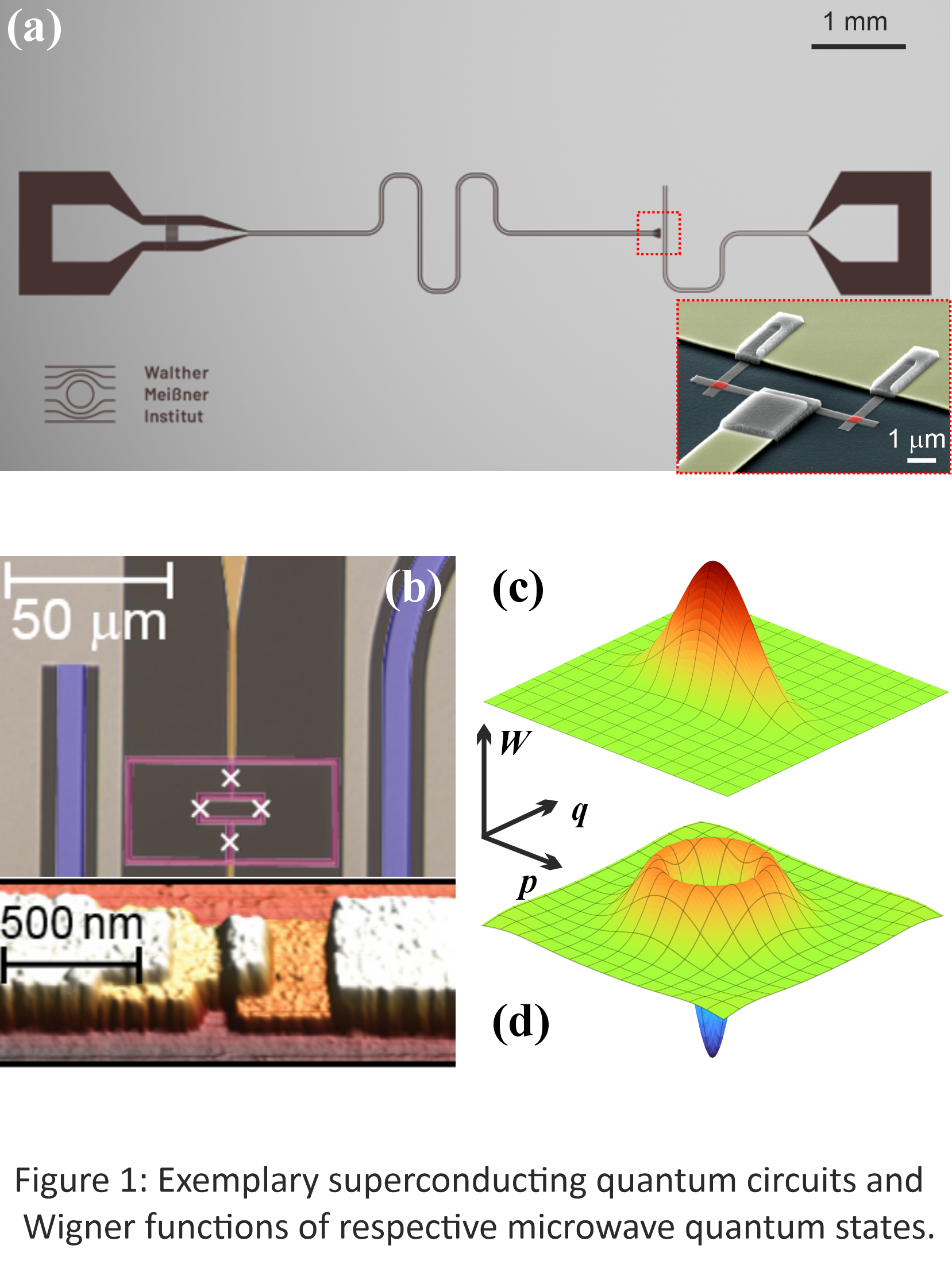 A particularly novel way to distribute entanglement between quantum nodes is to exploit Gaussian entangled states. In these protocols, one relies on a distributed two-mode entangled state, or bath, which may be off‑resonantly coupled to the remote qubits, thus avoiding some limitations of the QST approach. Moreover, theoretical works predict a possibility of entanglement distillation in this regime which allows to overcome moderate transmission losses. The necessary entangled two-mode states for these remote entanglement protocols can be conveniently generated with squeezed vacuum states generated by Josephson parametric amplifiers (JPAs) in the steady-state regime. Figure 1(a),(c) illustrates a particular flux-driven JPA design and the Wigner function of a related continuous-variable (CV) squeezed vacuum state. Discrete-variable (DV) Fock states correspond to the computational basis of modern gate-based quantum computing platforms and are routinely generated by superconducting qubits. Figure 1(b)(d) shows a particular flux qubit and the Wigner function of a single-photon DV state. A combination of the DV states emitted by qubits with the squeezed CV states forms the basis for the novel hybrid-variable regime of quantum communication. We imply that in hybrid-variable experiments, the corresponding CV and DV quantum states may be freely superimposed or mixed during various operations and quantum gates. The HVMQC goal is to develop fundamental understanding how quantum correlations are converted between continuous and discrete degrees of freedom, how various quantum states thermalize in nonlinear noisy networks, with a possibility of finding quantum scar states in the microwave regime. From the practical side, the realization of hybrid-variable microwave quantum communication protocols is directly connected to implementation of distributed quantum computing architectures and promises to resolve the challenge of superconducting qubit scaling beyond the modern thresholds imposed by individual cryostats.
